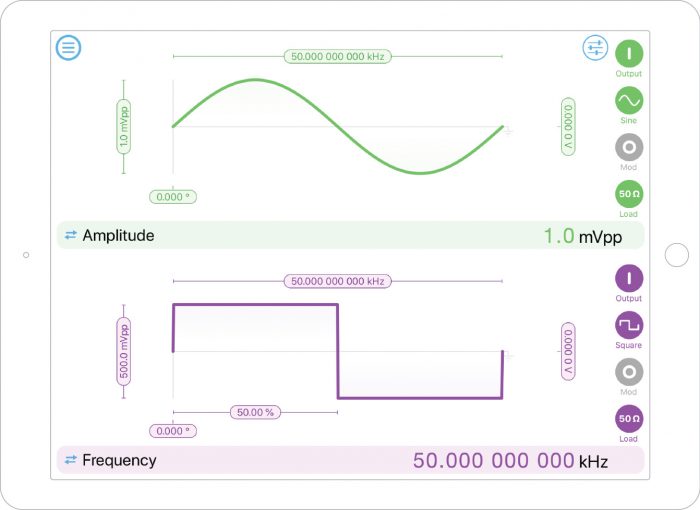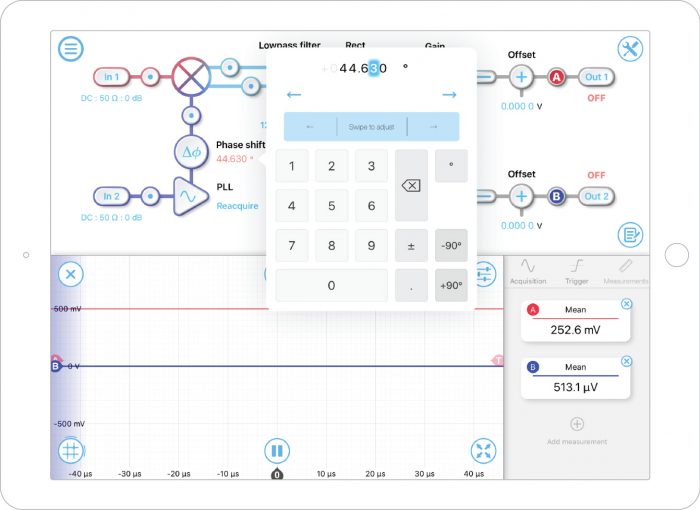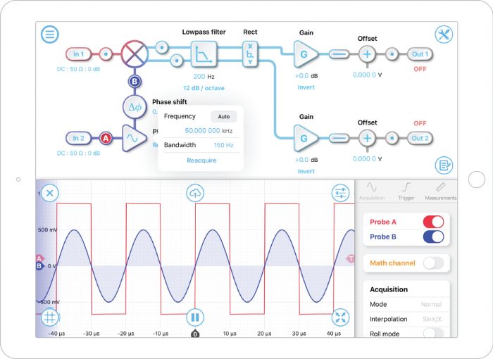 In this example, we used a second Moku:Lab’s waveform generator to simulate the signal and external reference for the LIA. A 50 kHz 1 mVpp sine wave was used as the signal, and a 50 kHz 500 mVpp square wave was used as the reference. (Figure 1) The signal and reference were generated based on the same clock (phase-locked), with an arbitrary phase relation to each other. This is a typical situation for a real experiment setup. Different electronic components have different instrument response functions and delays, which result phase difference between the signal and reference. The signal was connected to Moku:Lab’s LIA’s input 1, and the reference was connected to Moku:Lab’s LIA’s input 2.