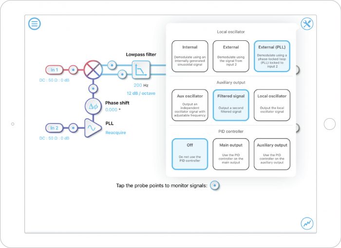 LIAs extract the amplitude and phase of the signal with respect to the LO. It’s crucial to ensure the LIA uses the correct LO for the demodulation process. In this example, we used Moku:Lab’s LIA’s built-in phase-locked loop (PLL) to track the phase and frequency of an external reference source and generated two phase-locked orthogonal sinusoidal LOs for the dual-phase demodulation. First, we configured the LIA’s LO to the external (PLL) mode and output to filtered signal for simultaneous X/Y or R/θ detection. (Figure 2)