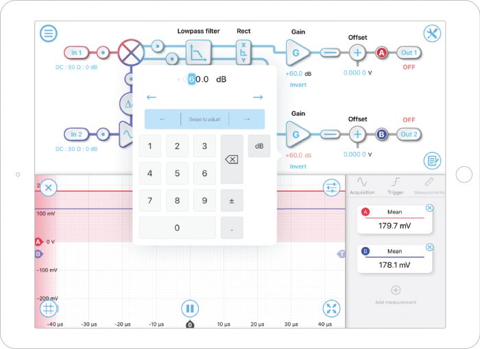 Once the LO was set, we enabled the probe points for the X/Y output. Then, we increased the output gain to about +60 dB to bring the signal to a few hundred mV range. (Figure 4) This was similar to the sensitivity settings on some other lock-in amplifier, which allowed Moku:Lab’s LIA output DAC to fully unitized its resolution and range. To avoid saturation, the sum of the X2 and Y2 should be kept below 1 V.