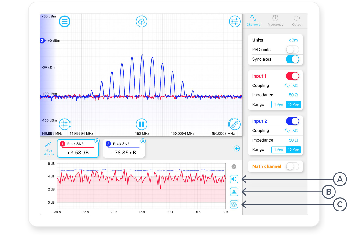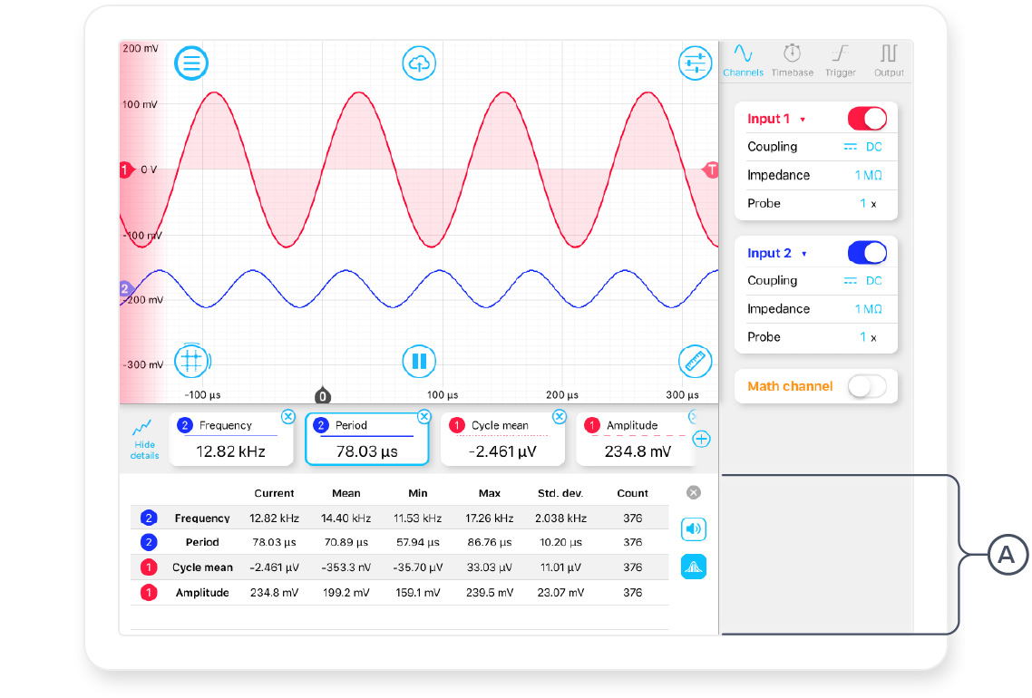 Measurements within the Oscilloscope and Spectrum Analyzer instruments now include statistics and the ability to enable audio of your signals.