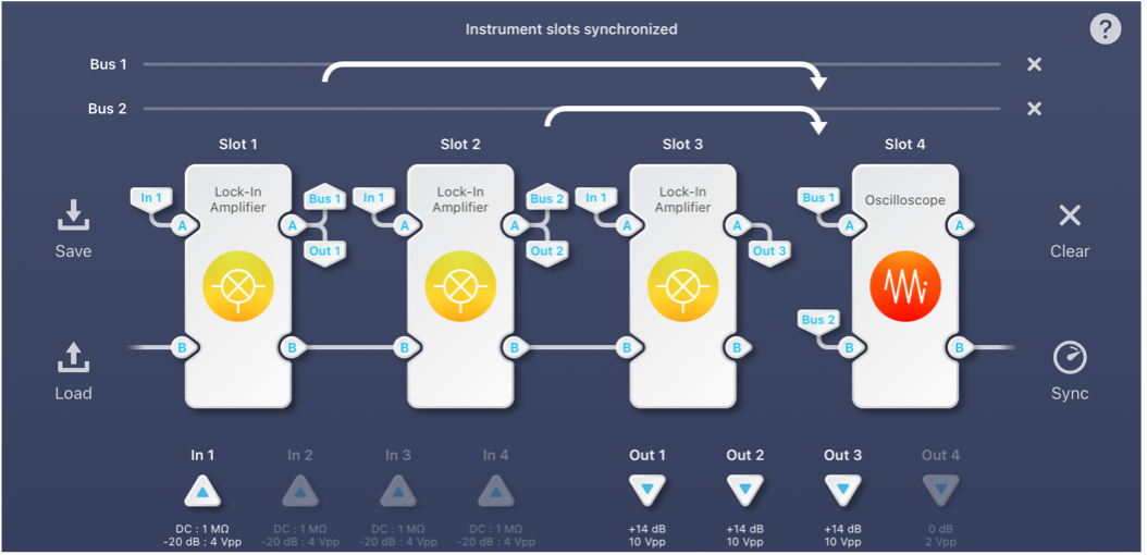 Figure 1 shows the starting point of building a multi-instrument system. Moku:Pro’s FPGA is divided into 4 instrument “slots”. Each slot represents a segment within the UltraScale+ FPGA and has access to Moku:Pro’s analog inputs and outputs. Signals can be passed between these instruments in the digital domain and without ever leaving the FPGA and are therefore lossless with deterministic, nanosecond-level latency. All 4 slots can be phase synchronized with one tap of the “Sync” button. Users have the flexibility to place Moku:Pro’s individual instruments into these slots, for example the Spectrum Analyzer, Oscilloscope, and PID Controller can be deployed simultaneously.
