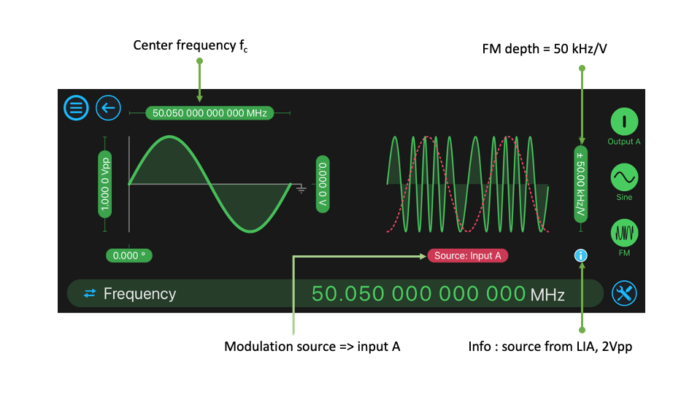 The Multi-instrument Mode inter-instrument busses are 2 Vpp, so the maximum FM deviation is +/- 50 kHz. It is also worth noting that the carrier is set to 50.05 MHz. This is a deviation 50 kHz from the lock-in’s local oscillator of 50 MHz, so that this example will need the full FM deviation range.