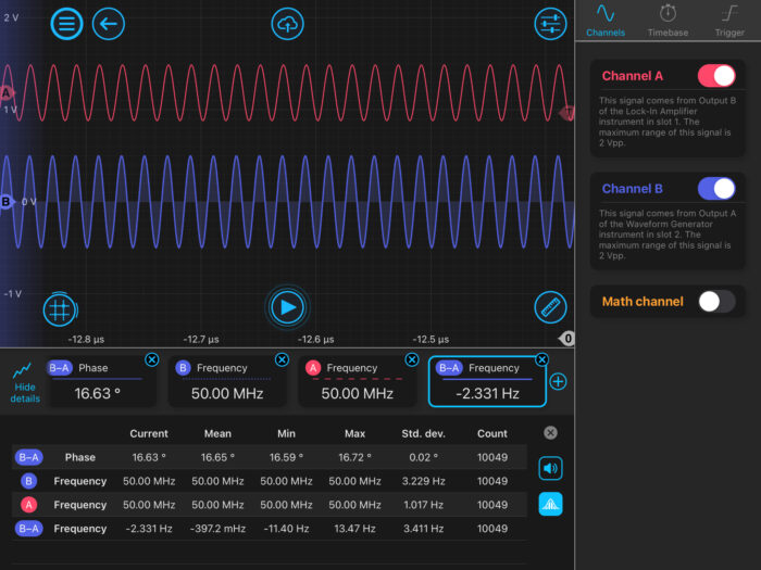 The intuitive graphical user interface allowed us to perform this experiment in a few minutes and observe the fast lock time and lock range (+/- 50kHz). We have observed the PLL locking in both time and frequency domains and used the Oscilloscope’s data logging to record statistics, including the standard deviation of frequency of the PLL.
