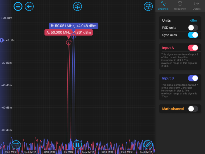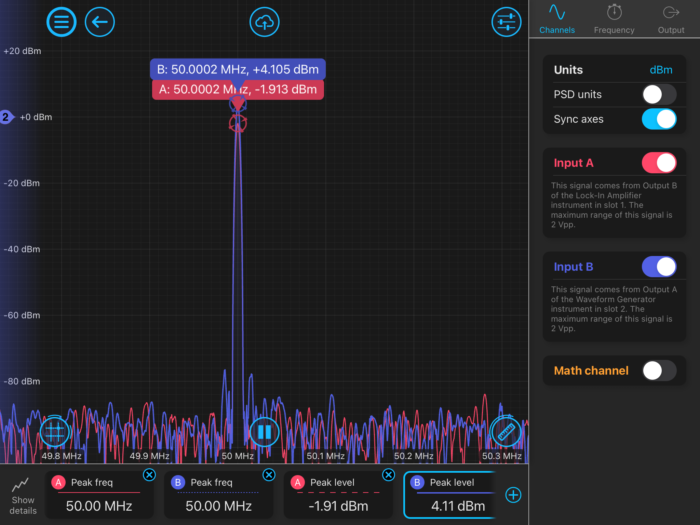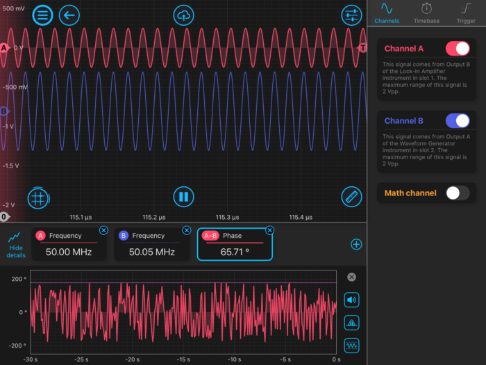 At initial setup, the Lock-in Amplifier is configured with its Output A turned off. The means the PD output is disabled and the Waveform Generator (WG) will output its FM signal at 50.05 MHz. Figure 6 is the user interface of the LIA in slot 1 with the built-in oscilloscope showing the LO at 50 MHz and the incoming signal on input A (the WG output) at 50.05 MHz. These signals are not locked and the incoming phase is continuously rolling past the reference LO.