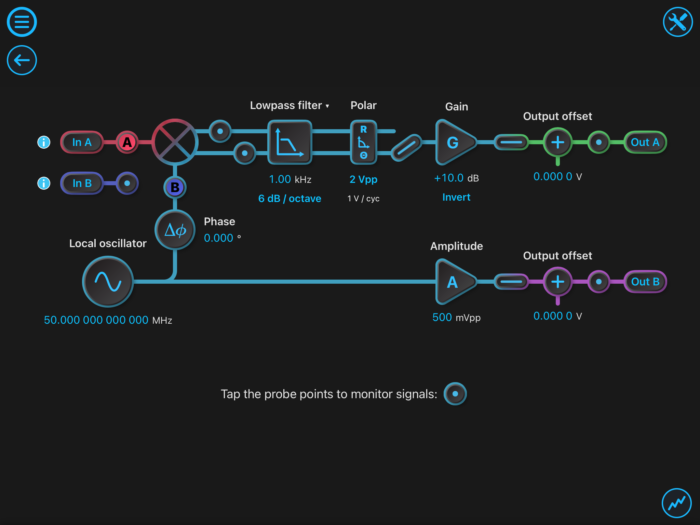 First we note that a lock-in amplifier (LIA) has a demodulation stage followed by a low-pass filter. The Moku LIA can also convert the X-Y output to magnitude and phase (r-Φ) and thus we can use the LIA as a phase detector. Figure 3 shows the Moku Lock-in Amplifier user interface with the local oscillator set to 50 MHz, the demodulator followed by a lowpass filter (1 kHz), rectangular to polar conversion, and finally gain and offset functions. The phase output of the polar conversion is fed to Out A and will form our phase measurement.