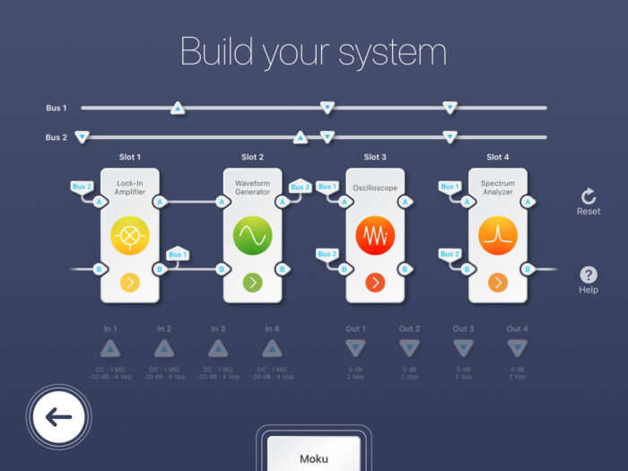 Figure 1 shows the starting point of building a multi-instrument system. Moku:Pro’s FPGA is divided into 4 instrument slots. Each slot represents a segment within the UltraScale+ FPGA inside Moku:Pro, and each has access to Moku:Pro’s analog inputs and outputs. Signals can be passed between these instruments in the digital domain without ever leaving the FPGA and are therefore lossless with deterministic, nanosecond-level latency. Users have the flexibility to place Moku:Pro’s individual instruments into these slots; for example, the Spectrum Analyzer, Oscilloscope, Frequency Response Analyzer, and PID Controller can be deployed simultaneously and in any combination.