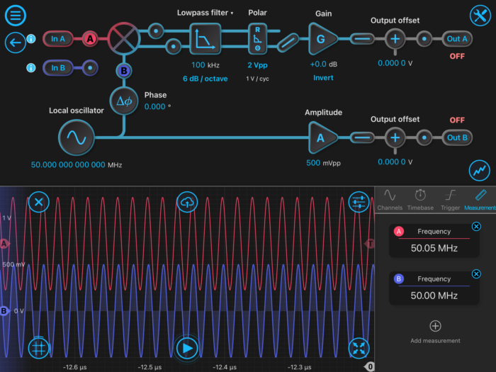 Now we enable the Lock-in Amplifier output with one single tap on Out A. The Lock-in Amplifier output is now driving an error signal representing the instantaneous phase error between the LO and the VCO output. The WG (VCO) responds and the loop locks while the WG output tracks the LO.