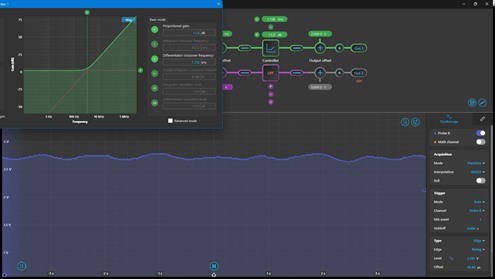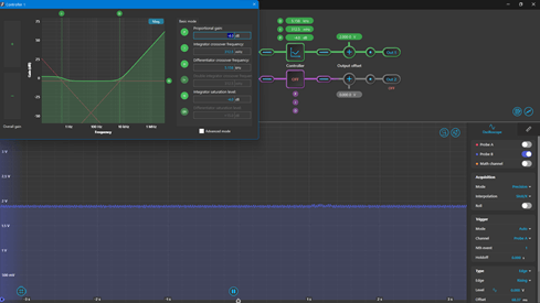 The embedded oscilloscope also has cursors and automatic measurements that allow quick characterization of the open loop response signal.