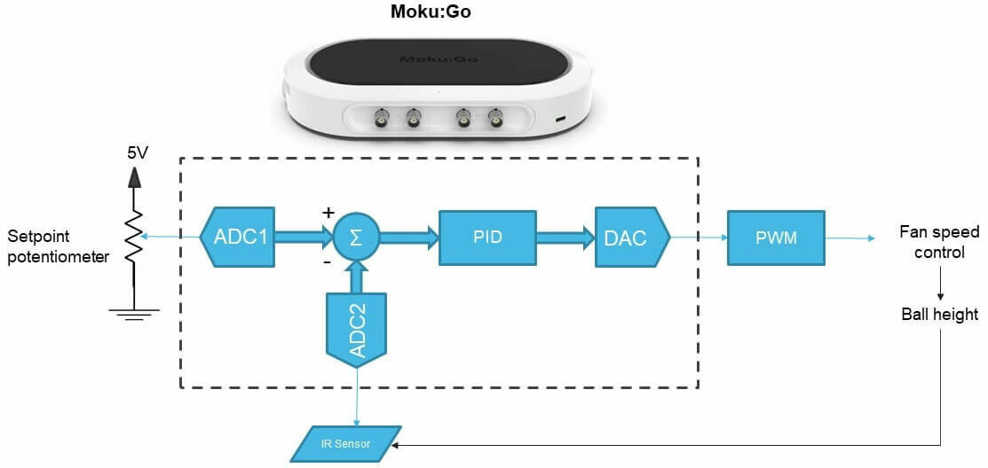 ADC1 will read the setpoint signal which is controlled by a potentiometer. ADC2 will read the IR sensor which is affixed to the top of the tube. These two signals are sent to the PID controller running on Moku:Go while the control signal is generated by the DAC and sent to the PWM driver circuit. This control signal will determine the PWM’s duty cycle, which will directly alter the DC fan and, subsequently, the ball’s height inside the tube.