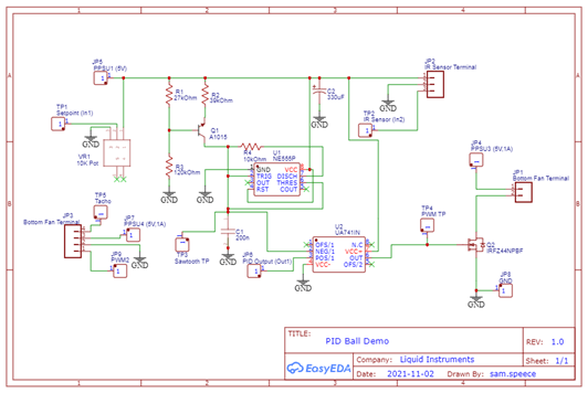 The PWM driver operates by using the NE555 timer (U1) to generate a sawtooth waveform which is fed into the inverting input of the comparator (U2). The PID controller’s output from the Moku:Go (Out1 or DAC1) is fed into the non-inverting input of the comparator, which generates a PWM signal. This signal is sent to a MOSFET (Q2) that controls the power consumed by the 5 V fan. The amount of power the fan sees directly translates to the height that the ping-pong ball will levitate.