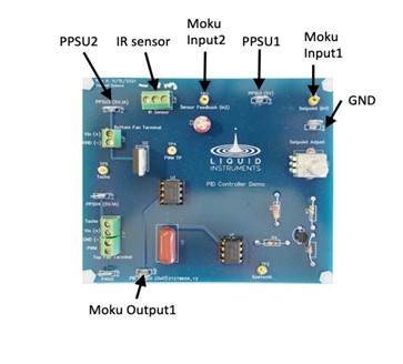 One Moku:Go will be used in this experiment to power the PCB, read sensor data, implement a PID controller, and generate a control signal. The Moku:Go M2 model has a four-channel programmable power supply unit (PPSU) that is very useful in projects like this and allows it to be a one-box solution for many labs. Two PPSU channels are used in this experiment to power the PCB and the DC fan which is the primary system to be controlled. Moku:Go also has two input channels for reading data and two output channels for generating waveforms. In this experiment, both input channels and one output channel are being used for reading data and generating a control signal. See the figure below for how the PID Demo kit and Moku:Go operate together in a closed-loop system.