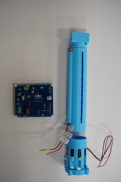 The other part of this lab setup is the mechanical system used to levitate the ball. It consists of a 5 V DC fan, 3D printed parts (tube, fan connector, and sensor connector), an IR sensor, and a ping-pong ball. The tube has a ¼ inch width slit in the side that acts as variable resistance to the system. There are smaller perpendicular slits marking every 20 mm. The markings should be used to measure from the top of the ball, because this is what the IR sensor sees first. This is important for tuning the PID controller later.
