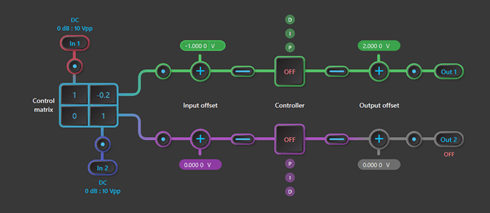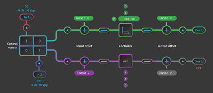 Before jumping into the closed-loop tuning method, it may be a good idea to test the system and get an understanding of how it operates and how to control it. The open-loop response of a system is a very common and straightforward measurement to make that involves sending a step input to the system under test and measuring its response. This can be done by setting the PID Controller’s control matrix to [1 0], the input and output offsets to 0 V, and enabling the proportional gain to 0 dB. This setup allows the output to track the input, which is the voltage being read by Input 1 from the setpoint potentiometer.