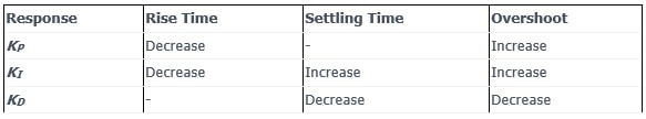 e. Now that the initial PID gains have been found, further tuning of the system can be done by trial-and-error using the table below as a guide for adjusting each gain based on the closed loop response to a step input. It is important to vary the setpoint between the minimum and maximum points while tuning for optimal gain values.
