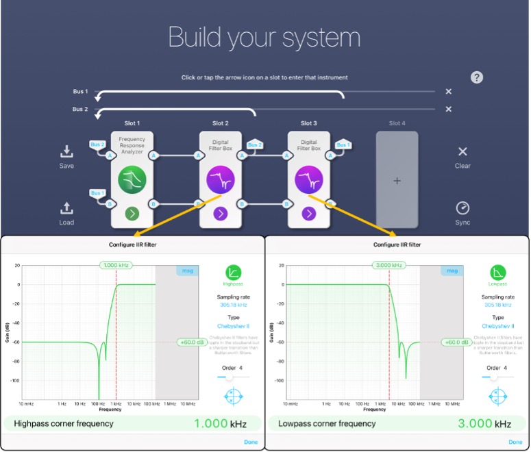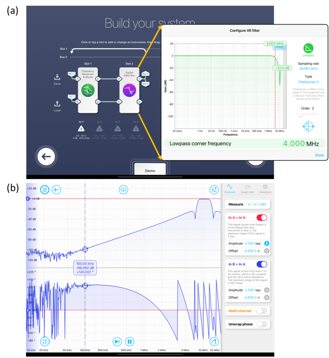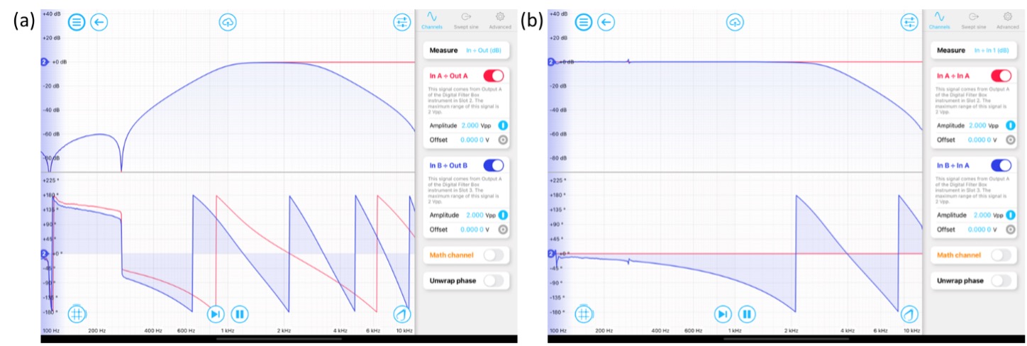 In many designs, an electronic filter is made by combining multiple filters into a multi-stage filter. The In÷In1 mode allows users to continuously probe the driving signal at the input of the DUT and use it as the reference for the relative amplitude calculation. Therefore, the frequency response of a subsequent DUT can be isolated from the overall frequency response of the system without changing the driving point. In this example, a two-stage filter was created using two Digital Filter Box instruments in Multi-instrument Mode (MiM). An FRA is deployed to probe the frequency response after each filter stage, as shown in Figure 1.
