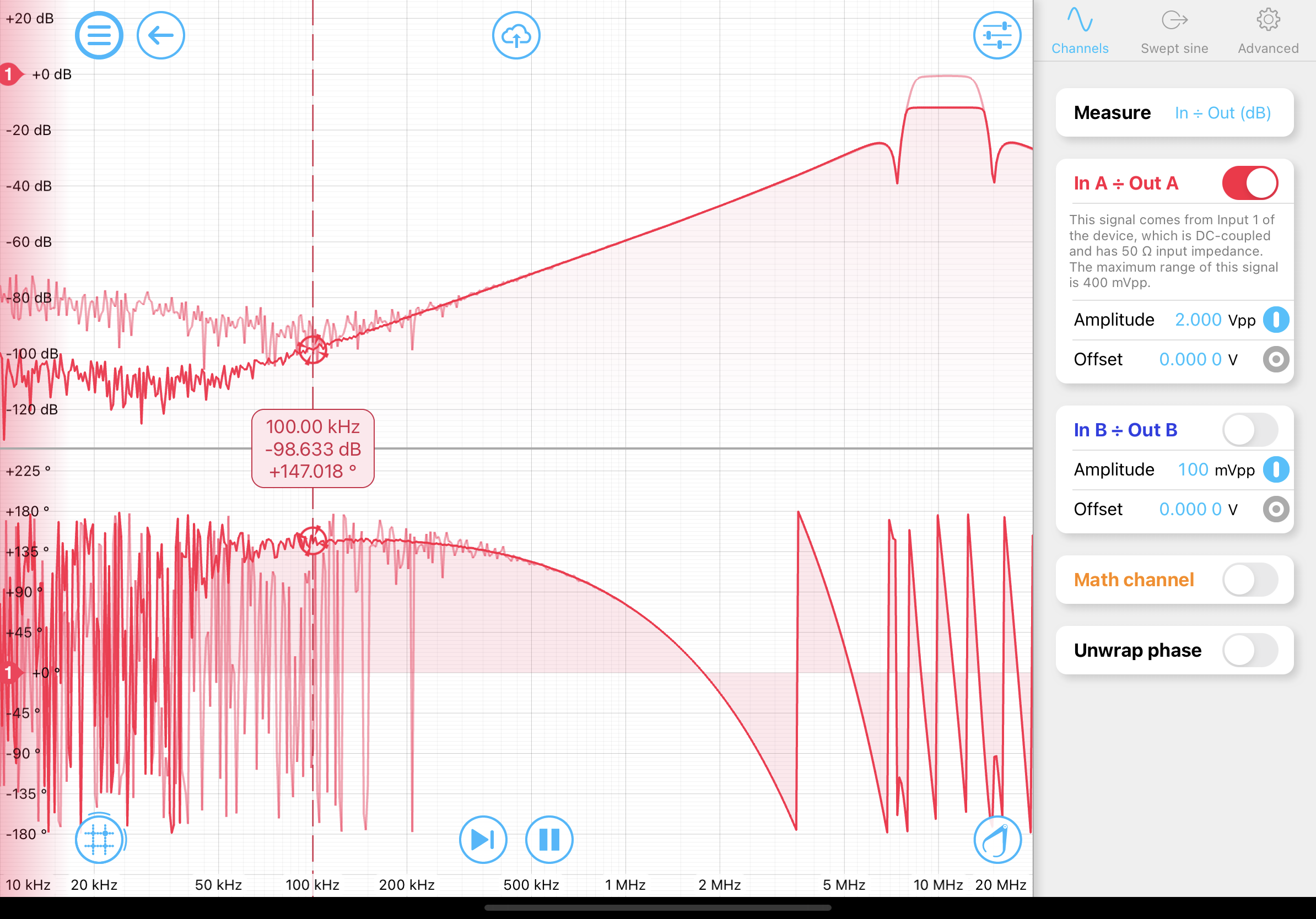 The upper and lower voltage limits which determine the dynamic range are bounded by the input range and analog front-end noise. For DUTs with high attenuation, a high amplitude driving source elevates the minimal response of the DUT. Therefore, a very high attenuation can be measured in dB. On the other hand, a high driving voltage may saturate the input for DUTs with low attenuation. For a DUT whose amplitude response varies strongly with frequency, it is hard to measure the frequency response with high dynamic range using a constant driving source, as shown in Figure 3. A bandpass filter was connected in between the input and output of Moku:Pro. The solid red trace was captured with a 2 Vpp driving output, and the faint red trace was captured with a 100 mVpp driving output. The higher output amplitude provided a significantly better floor below 100 kHz. However, the measurement was clipped at the passband.