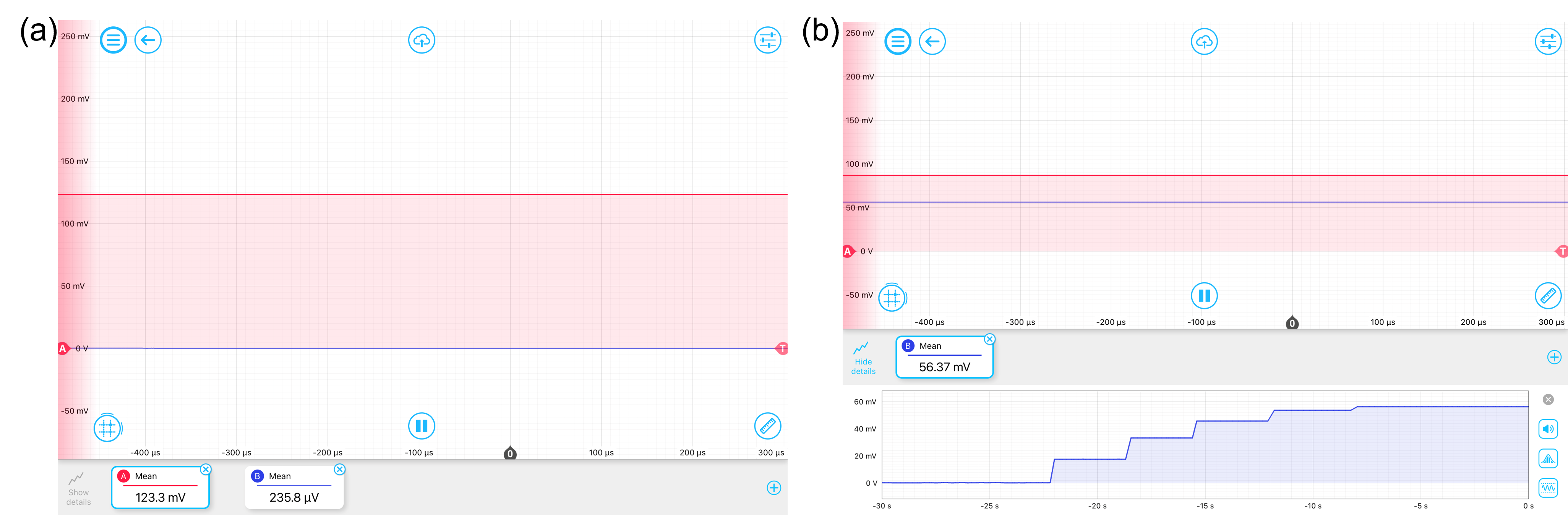 Figure 3: (a) Measured amplitude at the fundamental frequency (red) and the second harmonic (blue) by the two Lock-in Amplifiers at 50% duty cycle. (b) Measured amplitude at the second harmonic increased with increasing duty cycle.