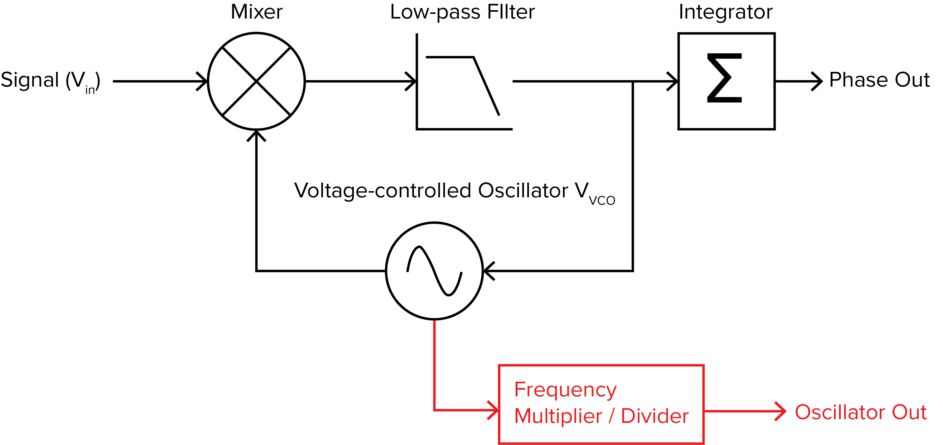 Figure 1: A simplified block diagram of Moku’s PLL. The frequency multiplier and divider feature is routed out of Moku’s voltage-controlled oscillator.