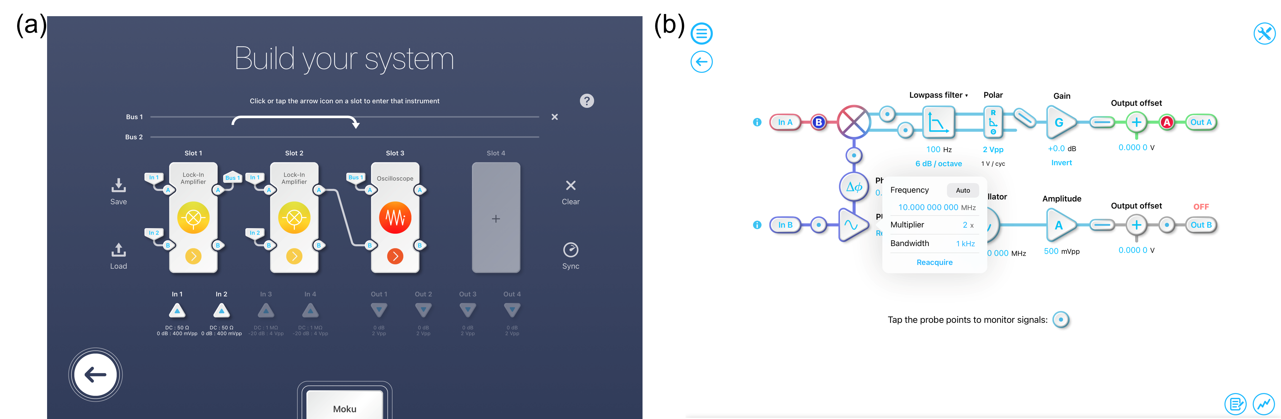 Figure 2: (a) Multi-instrument Mode setup for demonstrating multi-harmonic demodulation. (b) PLL settings for the second Lock-in Amplifier to demodulate at the second harmonic.