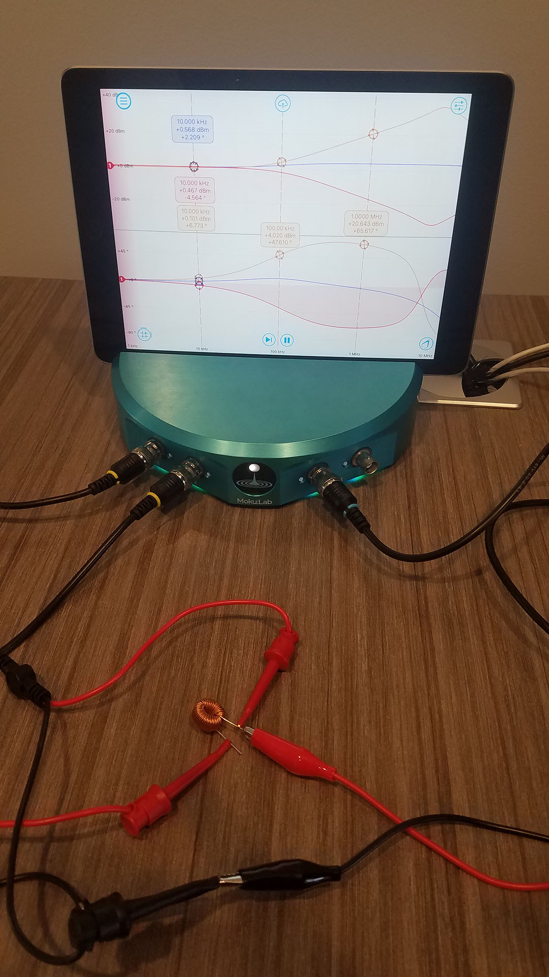 The Moku Frequency Response Analyzer can accurately measure the inductive impedance of component over frequency. The Frequency Response Analyzer is available on Moku:Go, Moku:Lab, and Moku:Pro.