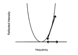 When locking a laser to a cavity, the light from the laser can only pass through the cavity when an integer number of its wavelength matches the round-trip length of the cavity. This is also the point when the reflected light from the cavity is at a minimum. Figure 1 shows the correlation between the reflected intensity and the frequency of the laser relative to the cavity resonance. However, it can be hard to use this signal as an error signal in a feedback system since the reflected light intensity is symmetric around the resonance, and it is positive both above and below the cavity resonance. If the laser frequency drifts away from the cavity resonance, it is impossible to know if the laser frequency needs to be increased or decreased. However, due to the minimum of the reflected signal intensity, the derivative of the reflected light will have a zero crossing with different polarity on either side of the resonance. It is negative when the frequency is below the resonance and positive when the laser frequency is above the resonance. The derivative of the reflected intensity can be measured by introducing small modulations to the laser frequency, also known as dithering. The PDH technique utilizes this derivative of the reflected intensity with respect to laser frequency as the error signal to dynamically adjust the frequency of the laser to match the resonance of the cavity.