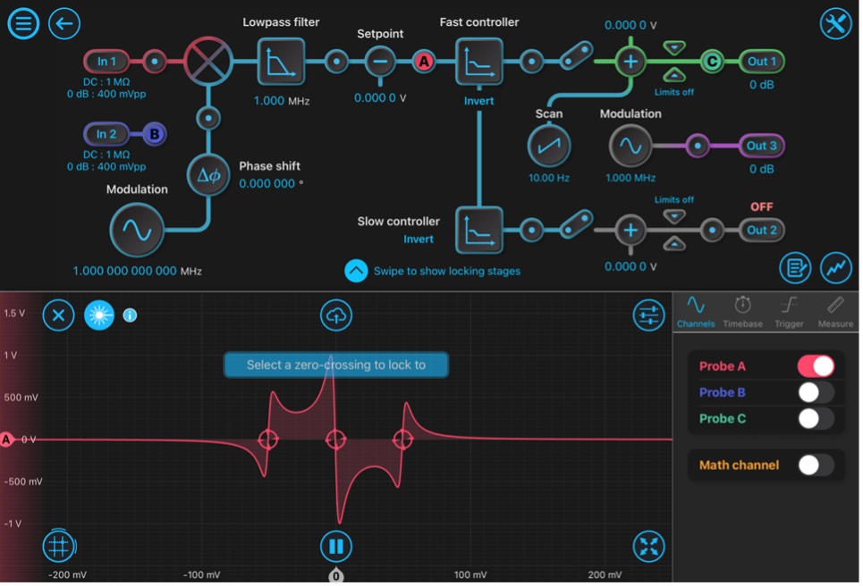 The traditional PDH locking process requires several dedicated, custom-made electronic instruments including signal generators, mixers, low-pass filters, servo systems, and oscilloscopes. The Moku:Pro Laser Lock Box integrates most of the PDH electronics into one compact, easy-to-use instrument that provides high-precision laser frequency locking. It includes a Waveform Generator for scanning and modulating the laser frequency, a mixer and low-pass filter for demodulating the error signal, and two cascaded PID Controllers to provide the fast and slow control signals back to the laser’s actuators, such as piezo or temperature controllers. Using the built-in Oscilloscope, users can also monitor the scanning response of the reflected light and display the PDH signals in real time (Figure 3).