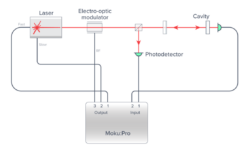 Figure 2 illustrates the components and layout of a PDH laser locking system. Here, the frequency is modulated with an electro-optical modulator (EOM) driven by the local oscillator. A photodetector captures the reflected light, and its output is demodulated with the local oscillator via a mixer. The mixed signal is then passed through a low-pass filter to separate out the DC, or very low frequency, component from the second harmonic of the modulation frequency. This DC component is used as the error signal, which provides an unambiguous indication of not only how far the system is from resonance but in which direction adjustments must be made to restore resonance. The error signal is then sent into a servo amplifier or proportional-integral-derivative (PID) controllers and into the tuning port on the laser, locking the laser to the cavity.