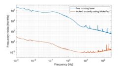 We verified the optimized control loop performance using a one-cavity-two-lasers test. A second laser was locked to the cavity one Free Spectral Range (FSR) above the first laser’s lock with a second identical Moku:Pro Laser Lock Box setup. With a lock at two independent frequencies, the two lasers were compared with identical common cavity noise but independent electronic noise and uncorrelated laser frequency noise. The residual frequency variation between these two locked lasers was independent of cavity spacer noise, thermal noise of the cavity coatings, and common vibrations from the laboratory environment. This noise, due only to the control loop and sensors, was measured by combining light from both laser paths into a high-speed photodetector, mixing down with a stable GHz function generator and using a Moku:Lab running the Phasemeter instrument to track the frequency deviations. Figure 7 compares the frequency noise before and after the laser was locked to the cavity with Moku:Pro. The system stability improved by approximately six orders of magnitude at 0.001 Hz. The frequency noise also reduced to 10-2Hz/√Hz.