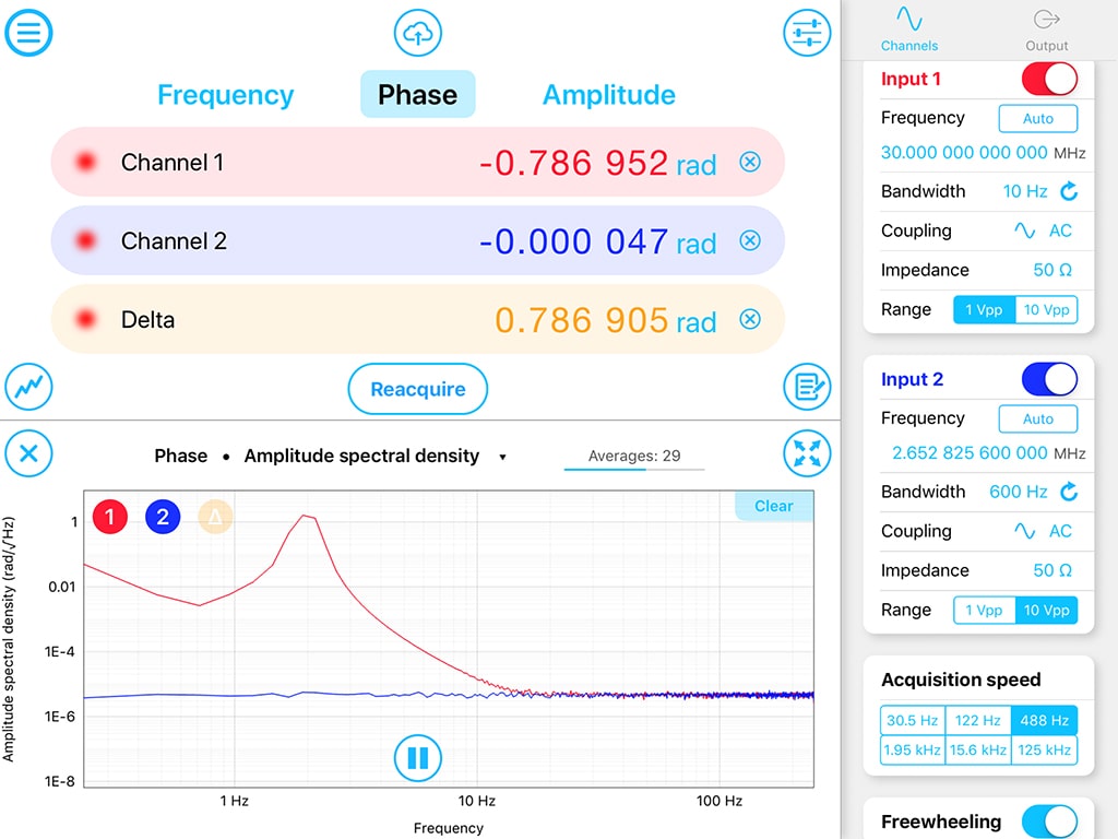 Our FPGA algorithms automatically and intelligently blend the high-speed and low-speed signals from the 10-bit and 18-bit ADCs to optimize noise performance across the entire frequency range. Rather than simply focusing on minimizing overall noise, the filtering network preserves a unity-gain frequency response for the signal. By utilizing this unique blending scheme, Moku:Pro allows seamless measurements with an optimal SNR across all Fourier frequencies, even for weak-signal applications.